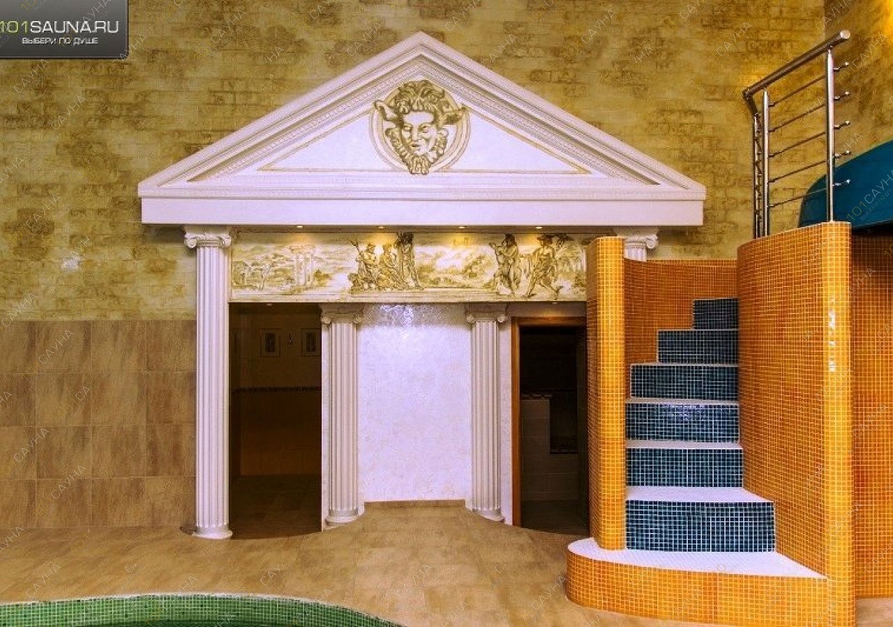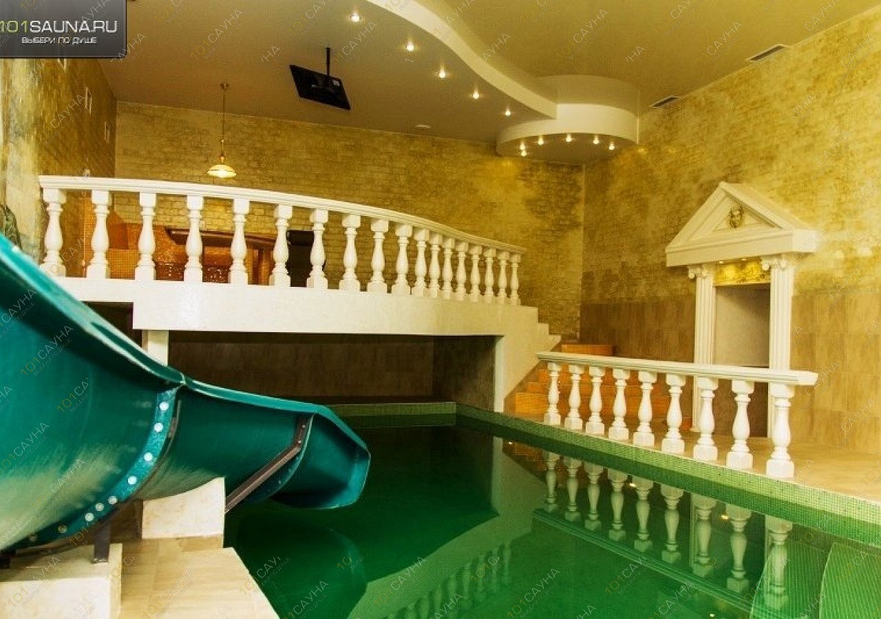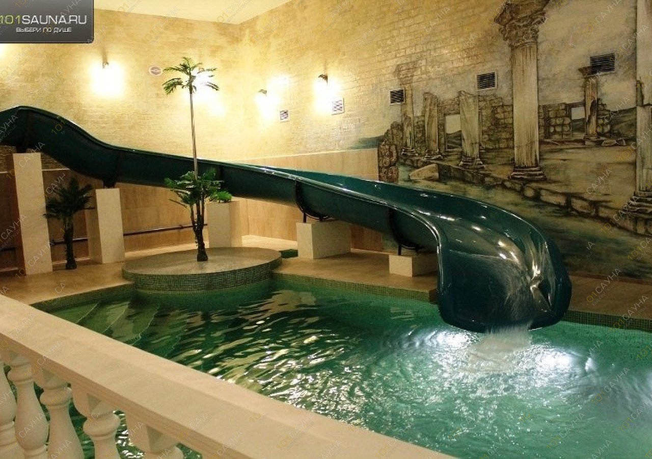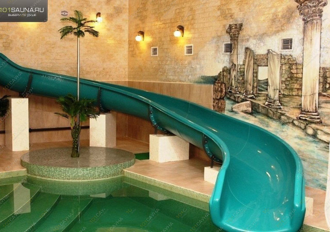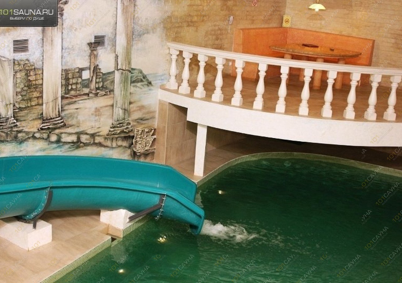 Зал «Греция» оформлен в стиле древней Эллады – фоном служит ручная роспись с изображением руин храма, противоположную стену украшает портик с ионическими колоннами, а у бассейна установлены точеные перила. Столик здесь расположен на небольшом балконе, так что родители могут с удобством устроиться в шезлонге и наблюдать сверху за резвящимися на горке детьми.