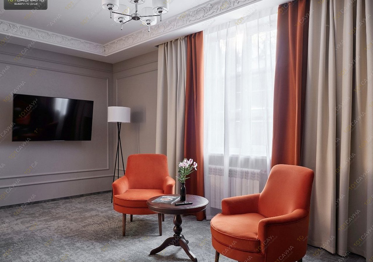 Классический интерьер двухкомнатных номеров категории «Люкс» приглашает прикоснуться к современной роскоши. Стильная мебель и декоративные предметы интерьера создают неповторимую атмосферу в сочетании с лепными колоннами, масляной живописью, зеркалами. Один из люксов имеет собственную террасу, с которой открывается вид на внутренний дворик отеля.