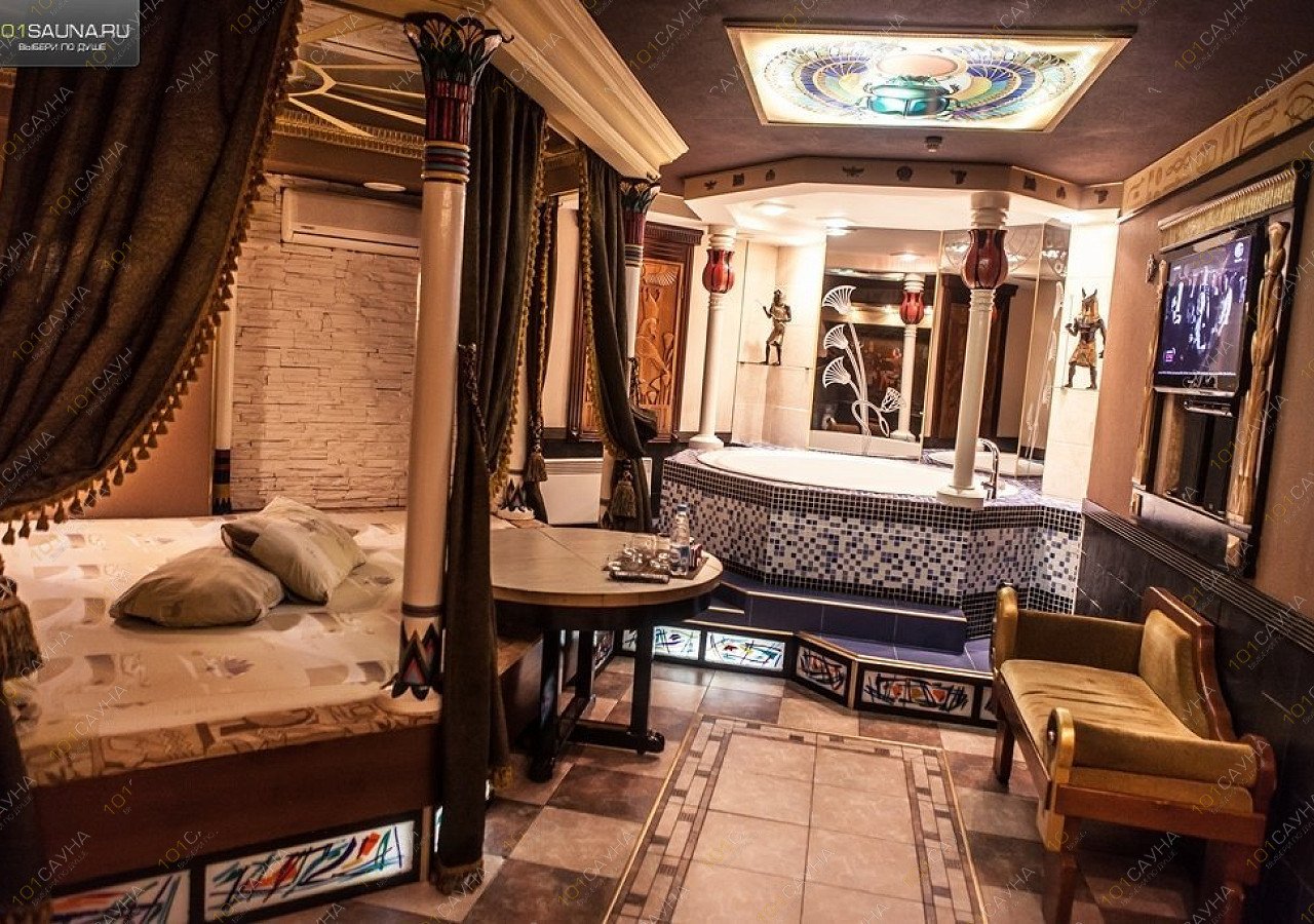 Интерьер сауны «Запад» выполнен в стиле древнего Египта с «ложем Клеопатры».