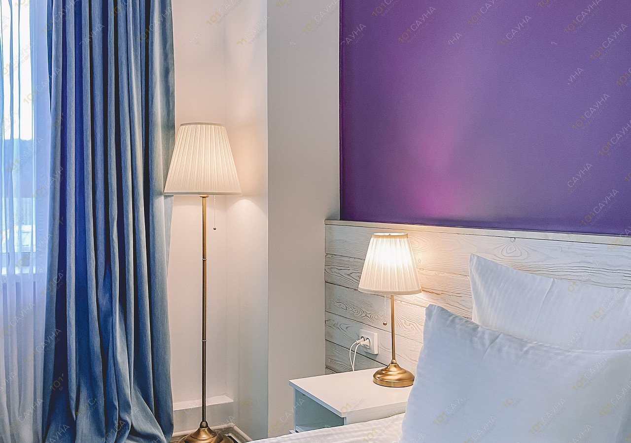 Гостеприимный люкс в отеле Никола ждет вас. Яркий дизайн интерьера в фиолетовых тонах создает отличное настроение. Окна люкса выходят на озеро Байкал.