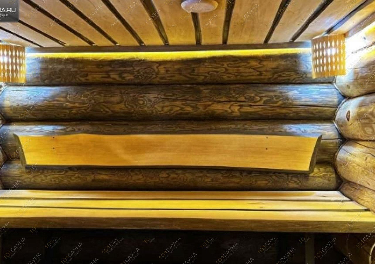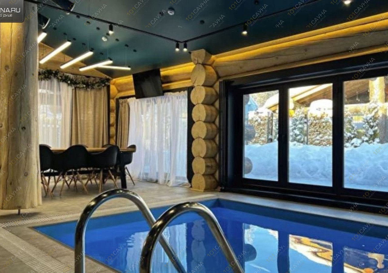 Современный банный комплекс из натурального бревна в теплых, светлых тонах. Панорамные окна с видом на природу, веранда с мангалом. Внутри расположены: сауна, бассейн, удобная раздевалка, гардеробная, кухня (гарнитур, питьевая вода, чайник, микроволновка, холодильник), санузел, душевая кабина, комната отдыха диваном, музыкальный центр с караоке.