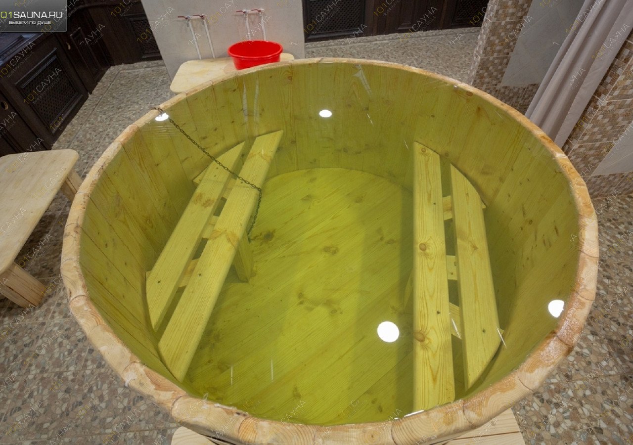 Мыльное отделение: душевые, 2 кедровые купели одна с прохладной проточной водой, вторая с теплой, обливные устройства для контраста.