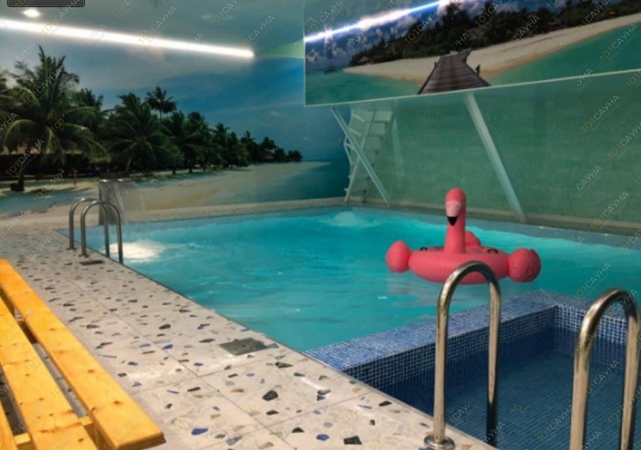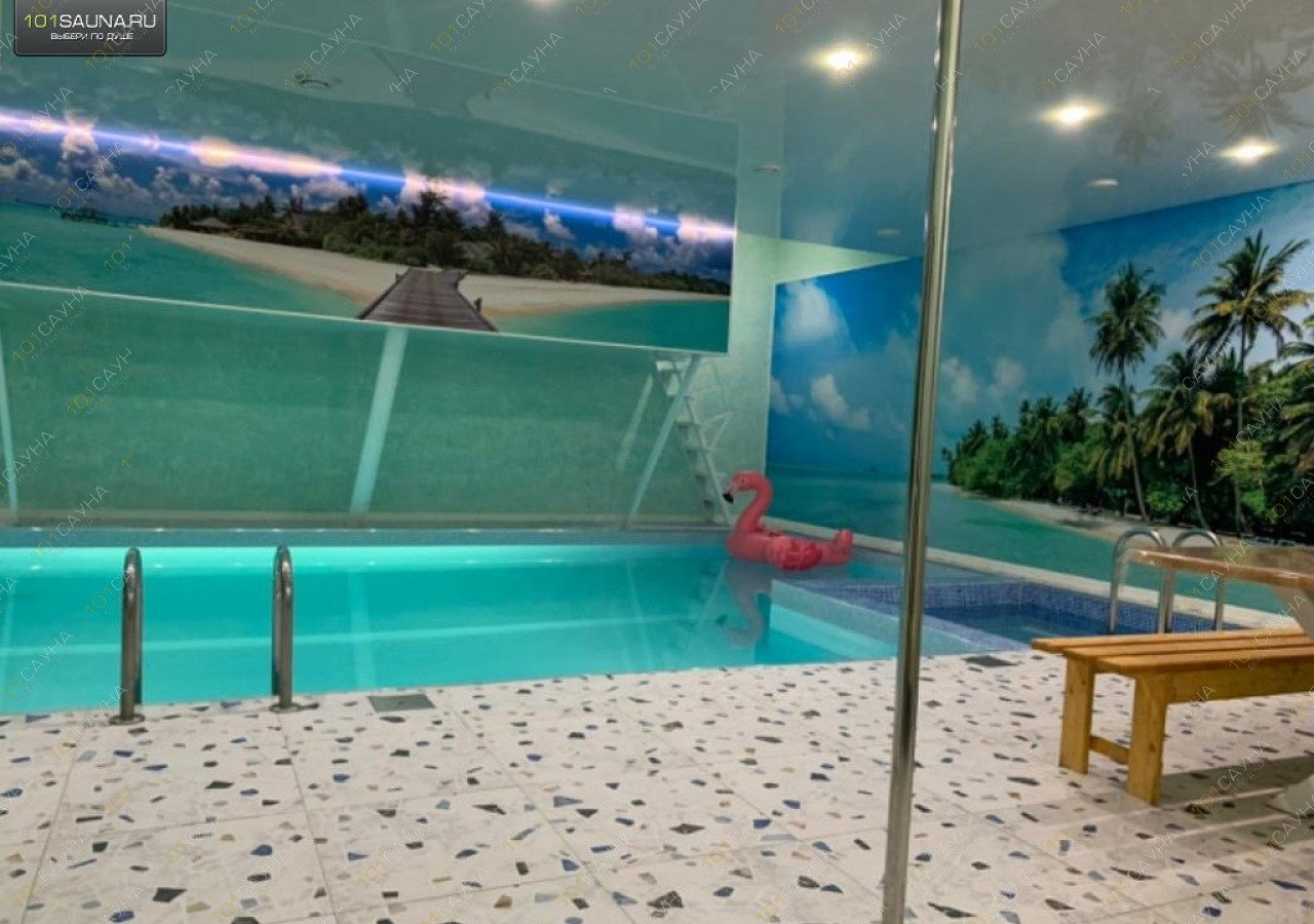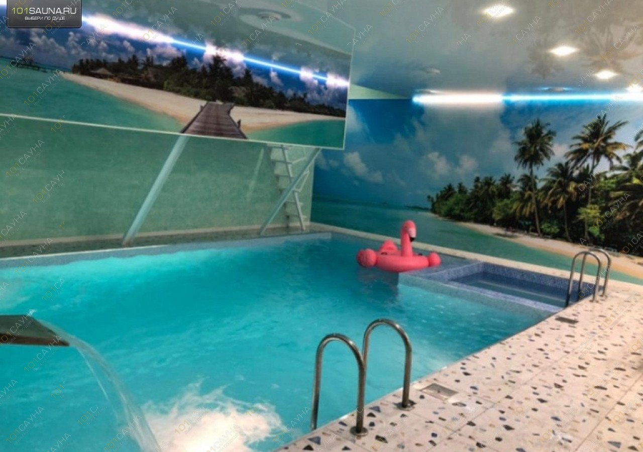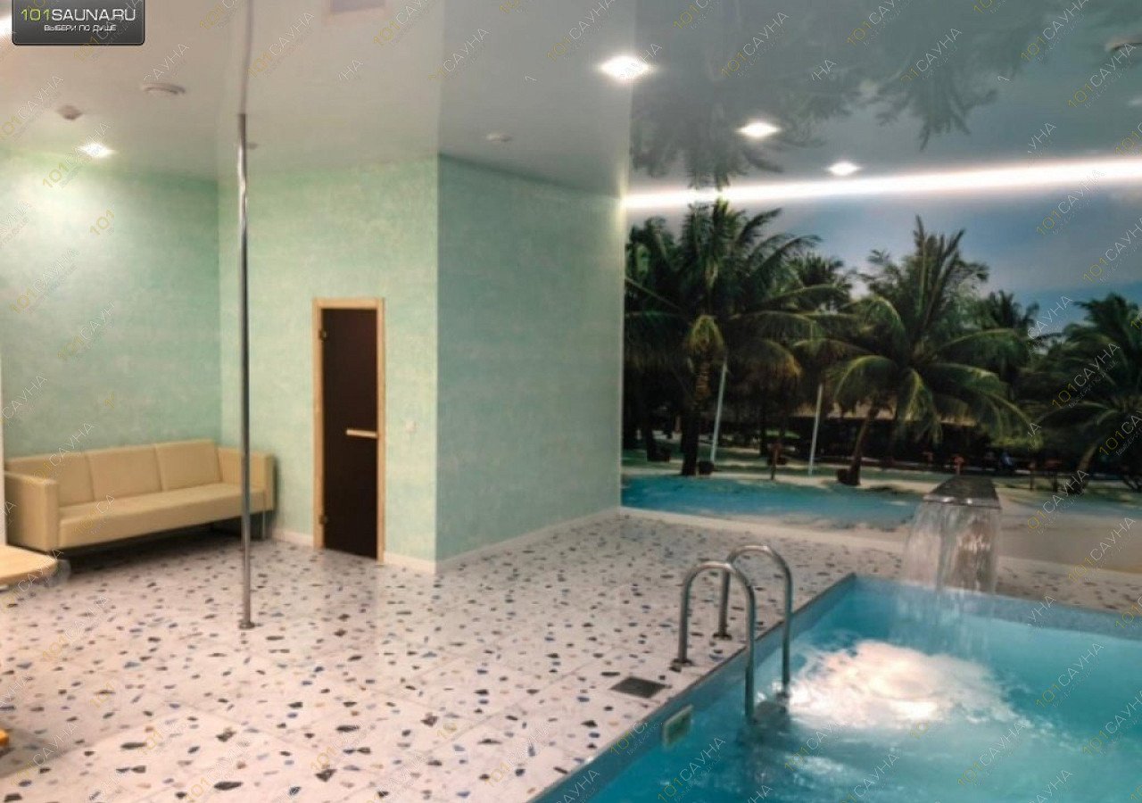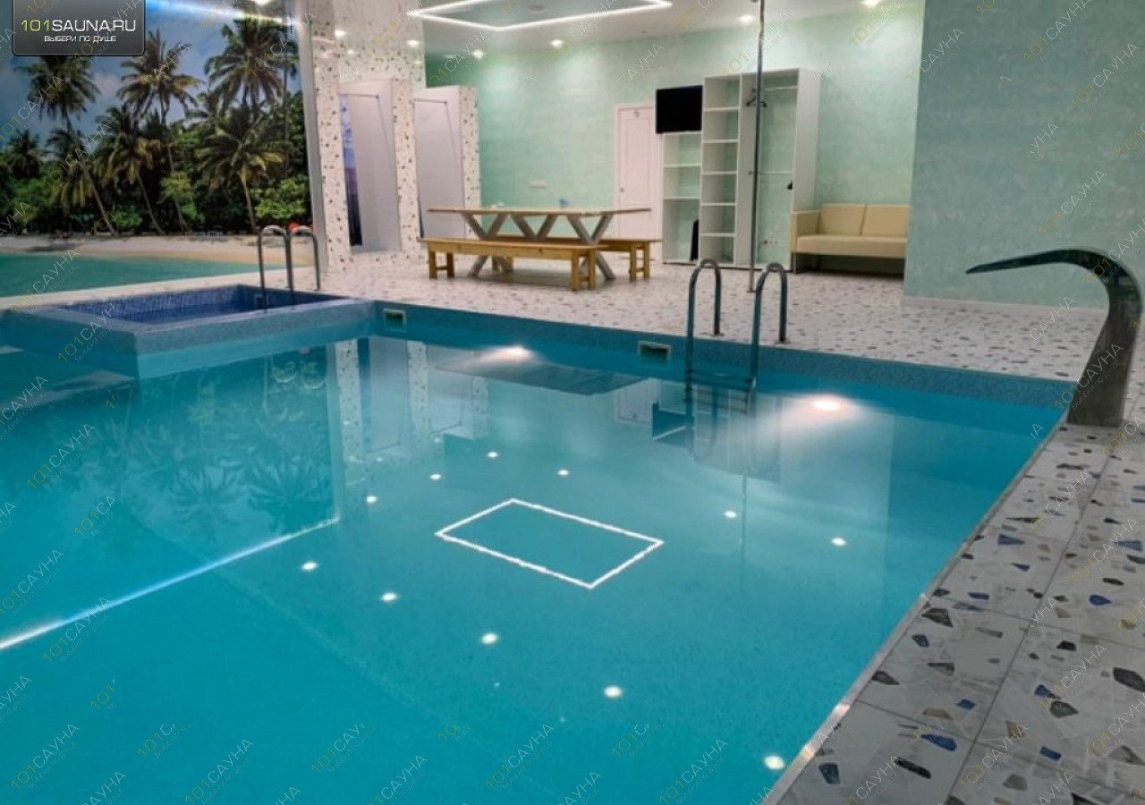 Большой номер для большой компании. Основную площадь занимает внушительных размеров бассейн с водопадом, гейзером и гидромассажем, очистка воды производится по передовой технологии с использованием озона. К услугам гостей караоке, массажное кресло, комнаты для уединений.