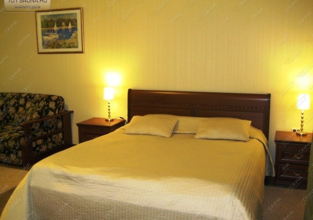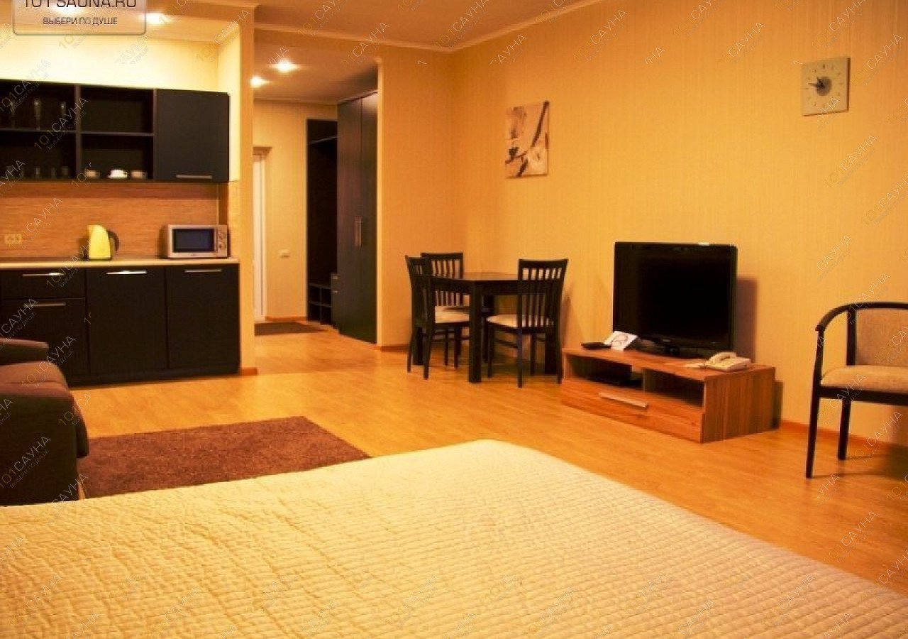 В номере: большая комната со встроенной кухонной зоной (полностью оборудованной, встроенная электроплита), двуспальная кровать, балкон, ванная комната (душевая кабина (с гидромассажем и джакузи), инфракрасная сауна, санузел, фен, космет. набор, халаты, тапочки). ЖК-телевизор, DVD проигрыватель, сейф, телефон, холодильник, диван, кресла, журнальный столик.