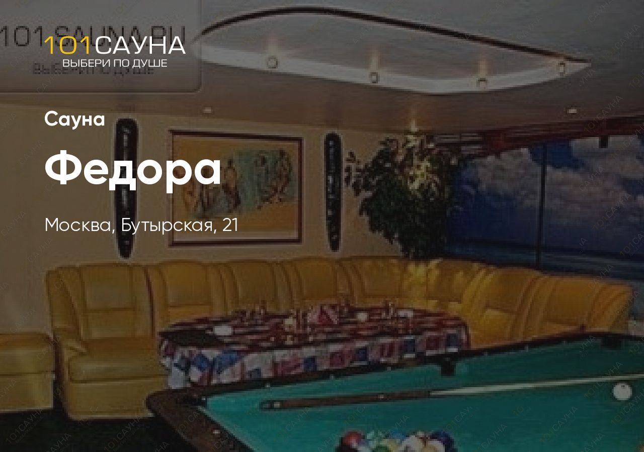 Сауна Федора на Дмитровской позволяет недорого и удобно отдохнуть в Москве. Вы можете прийти сюда в любое время. Сауна Федора на Дмитровской находится около метро Савёловская. Радушный и вежливый персонал встретит вас круглосуточно.