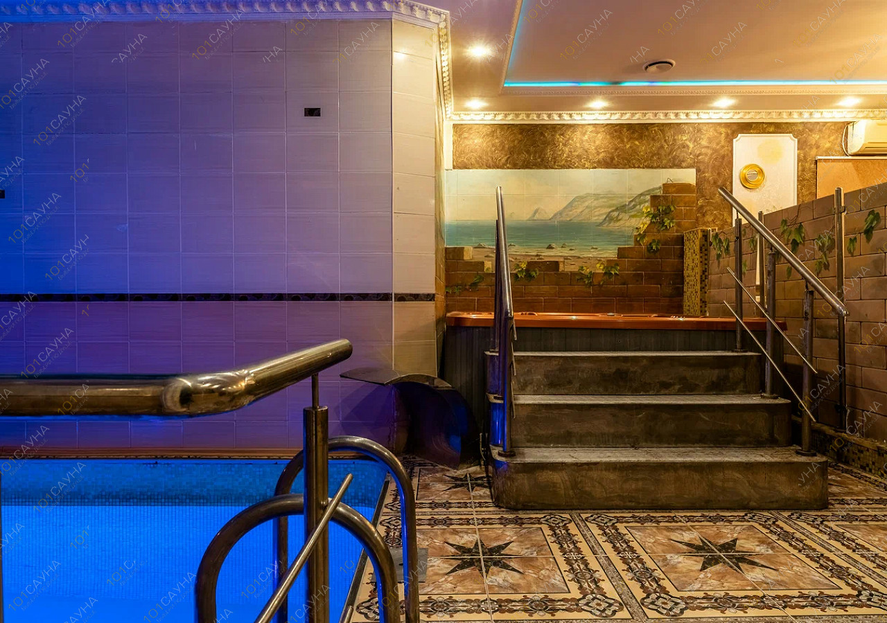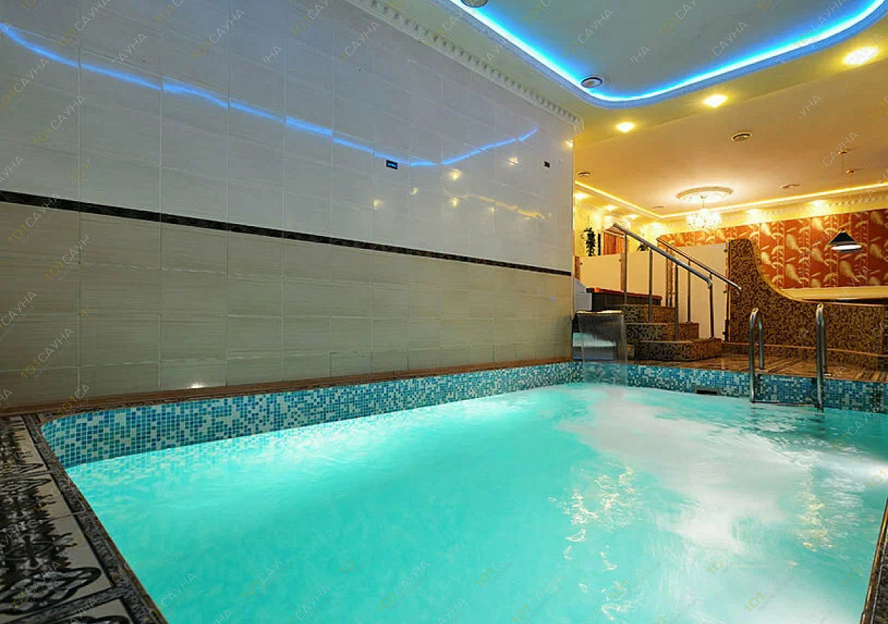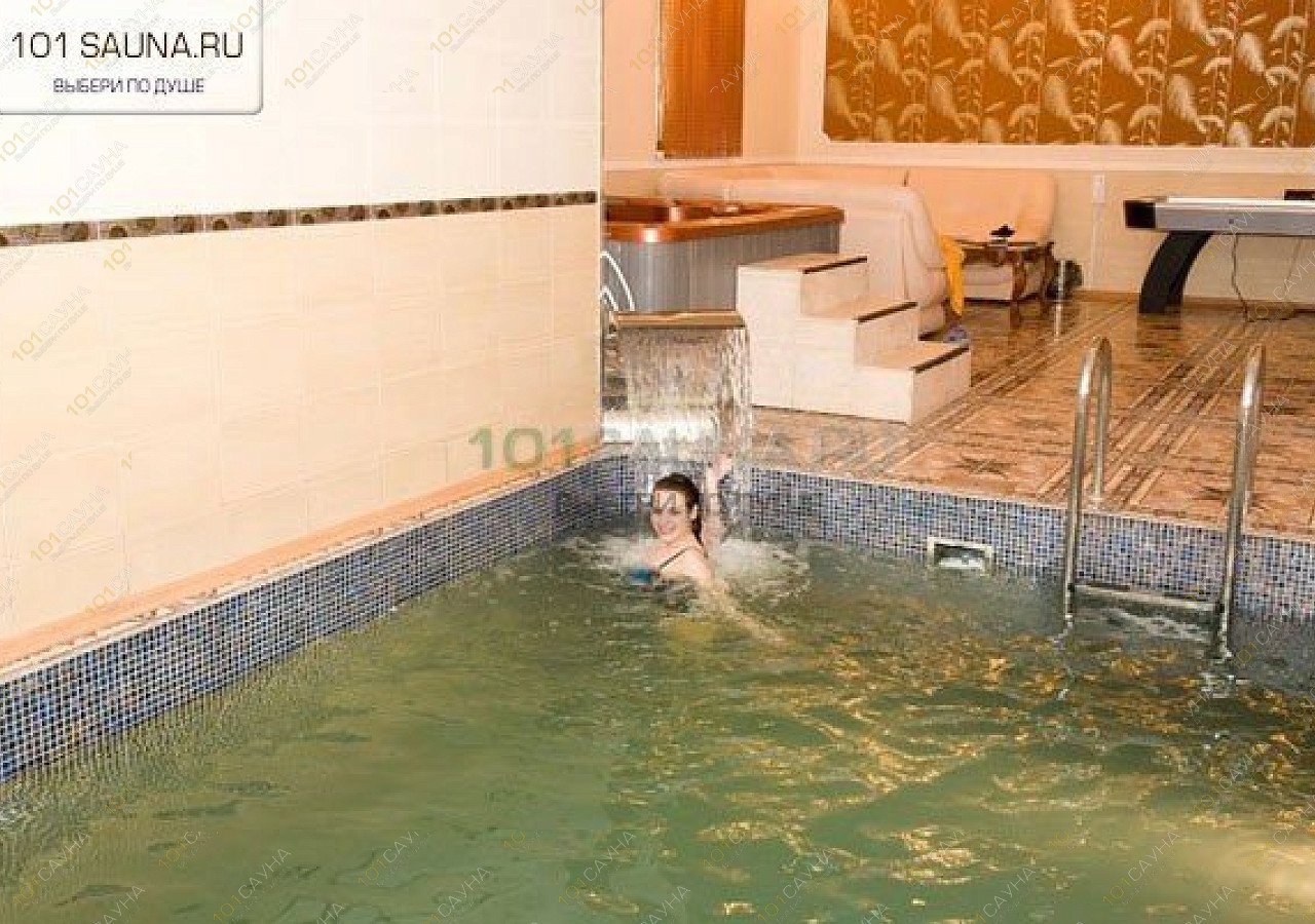 Большой бассейн 3,5х5 м разноуровневой глубины, с подсветкой, чистейшей водой и ниспадающим, струящимся водопадом.