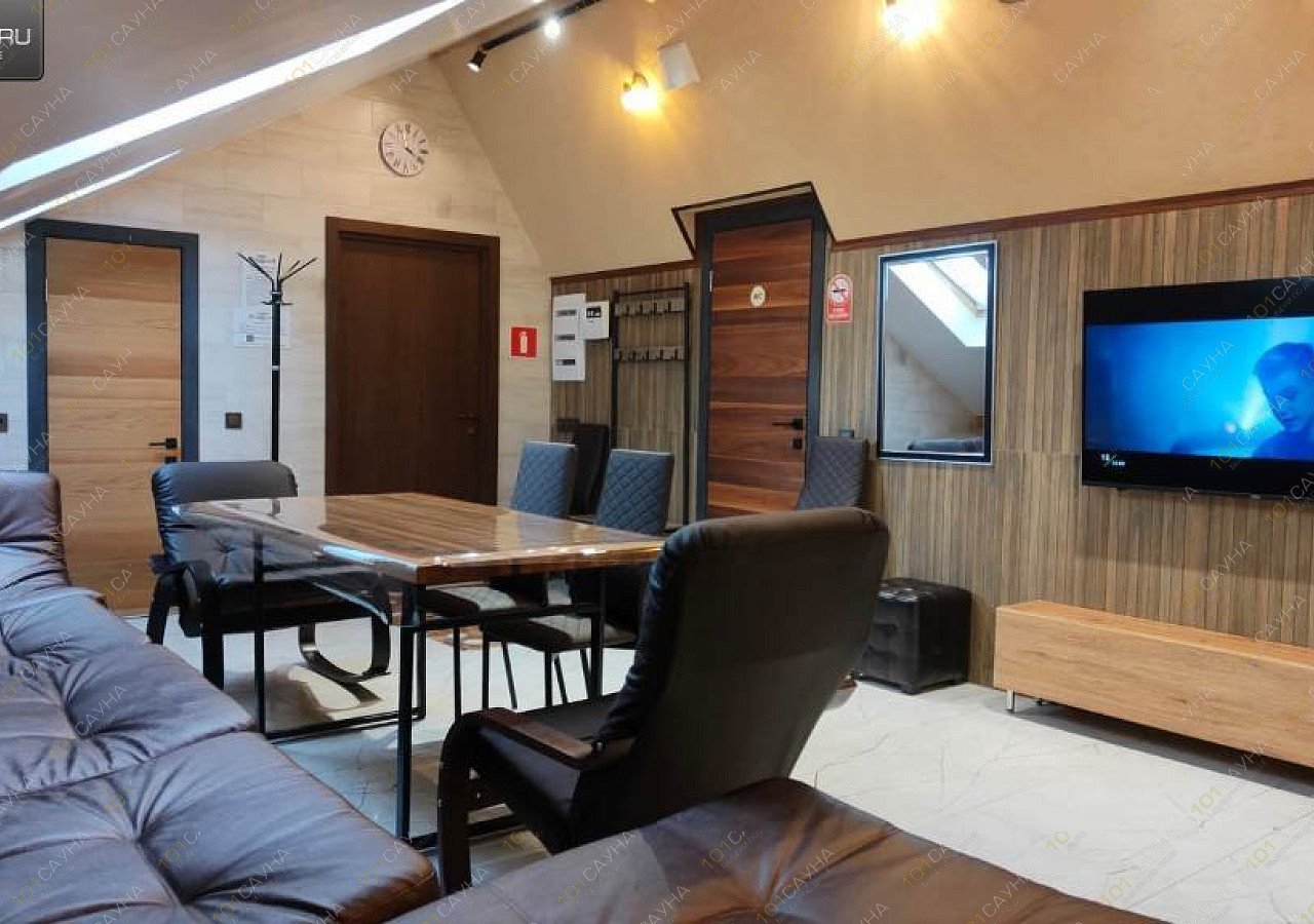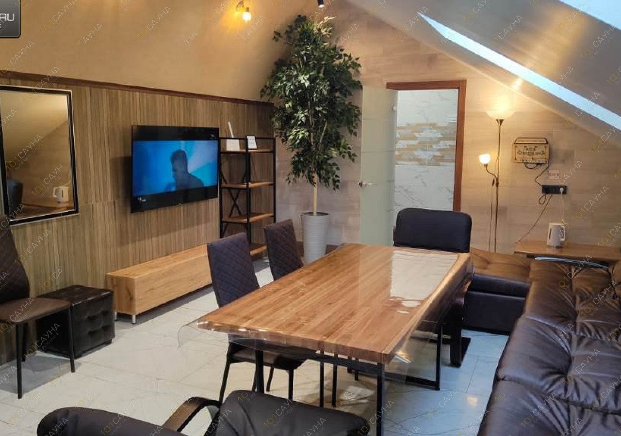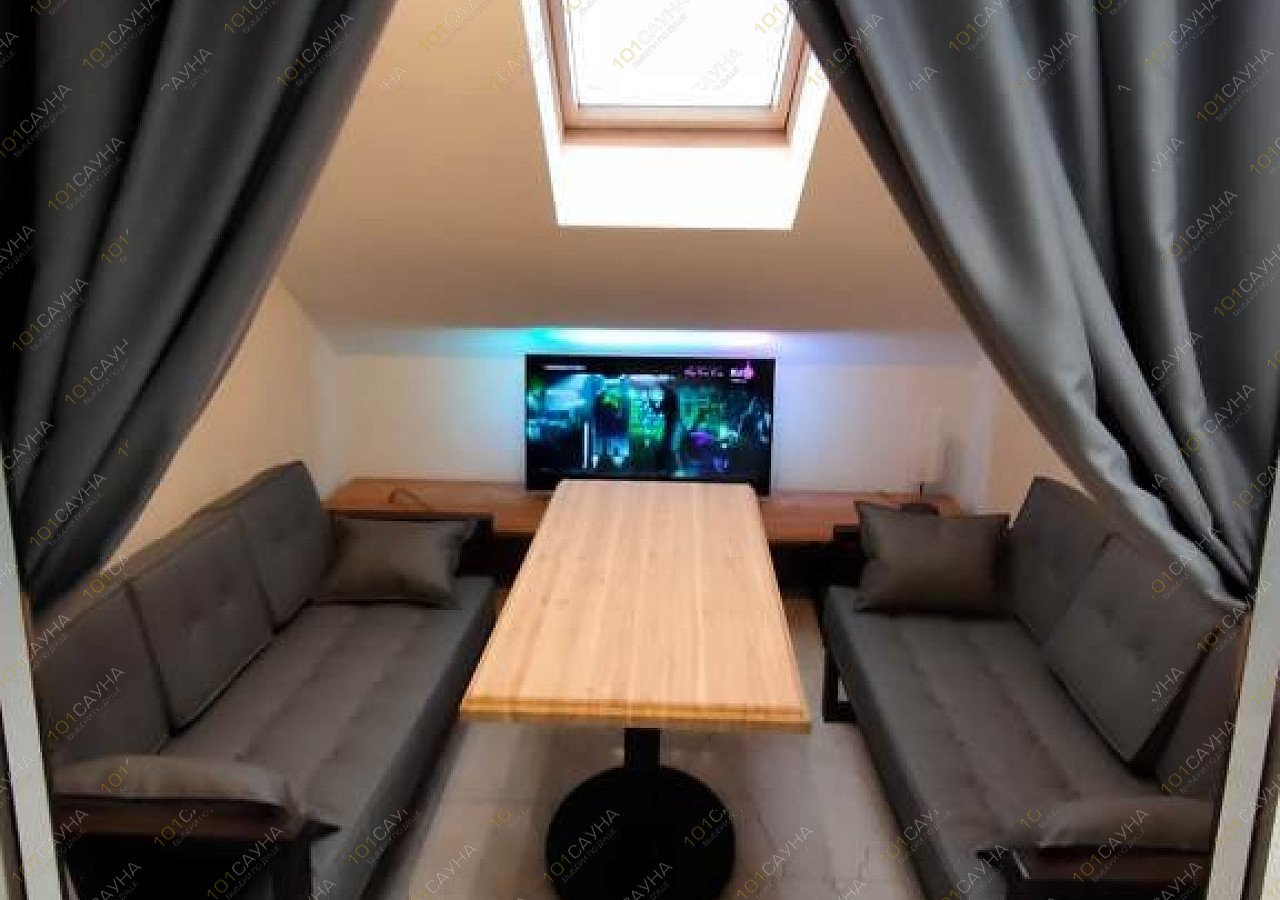 Сауна в стиле лофт на 6 человек, оборудована купелью, большим плазменным телевизором, зоной отдыха. У нас работает ресторан, где вы можете заказать любые блюда, разливное пиво и крепкий алкоголь.