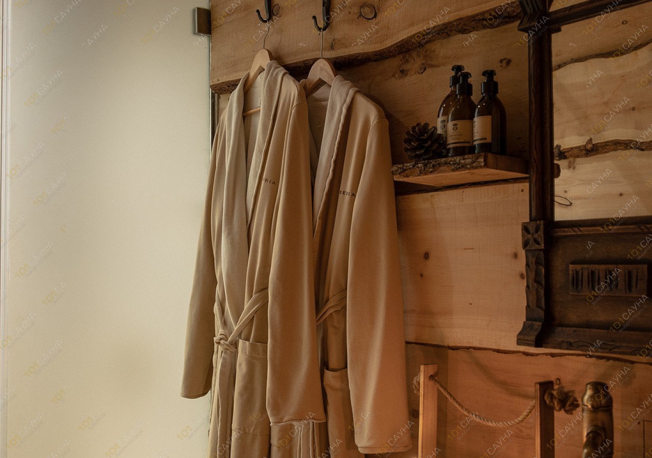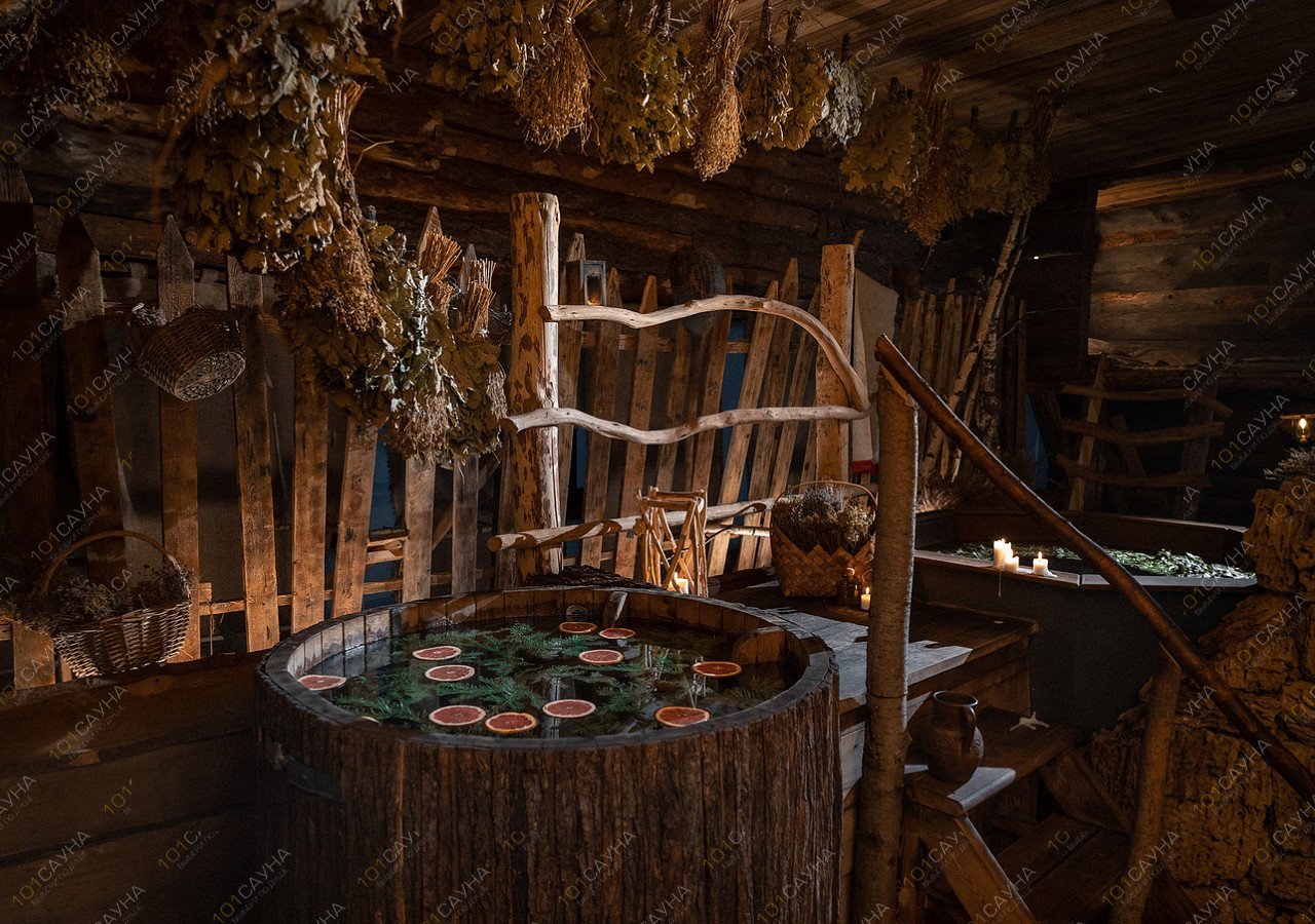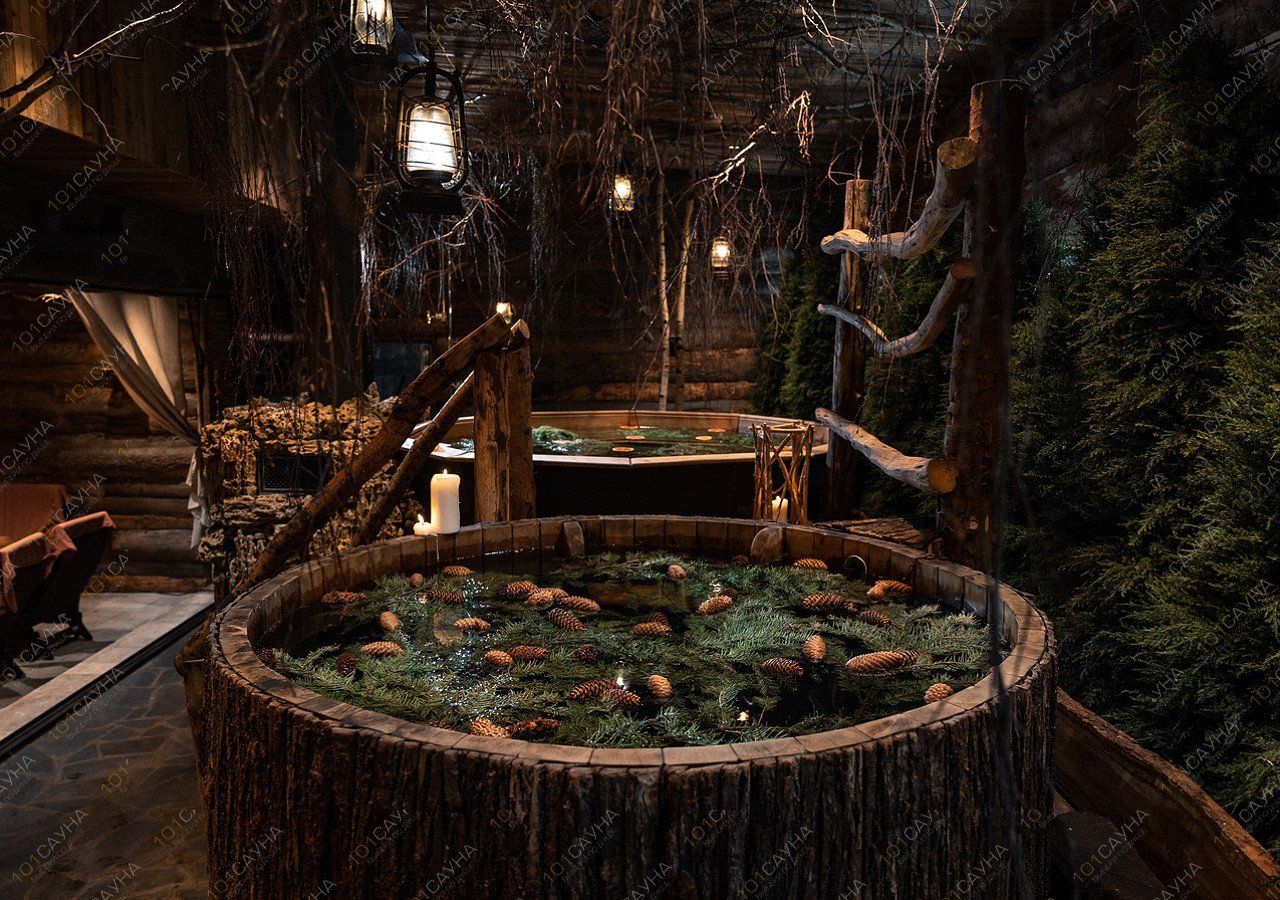 В бане используем очень много хвойных ароматов, в том числе их даёт парение можжевеловыми вениками. Отдыхая в горячем хвойном чане среди живых елок, гости слышат звуки сибирской тайги.