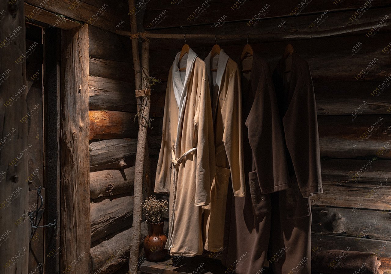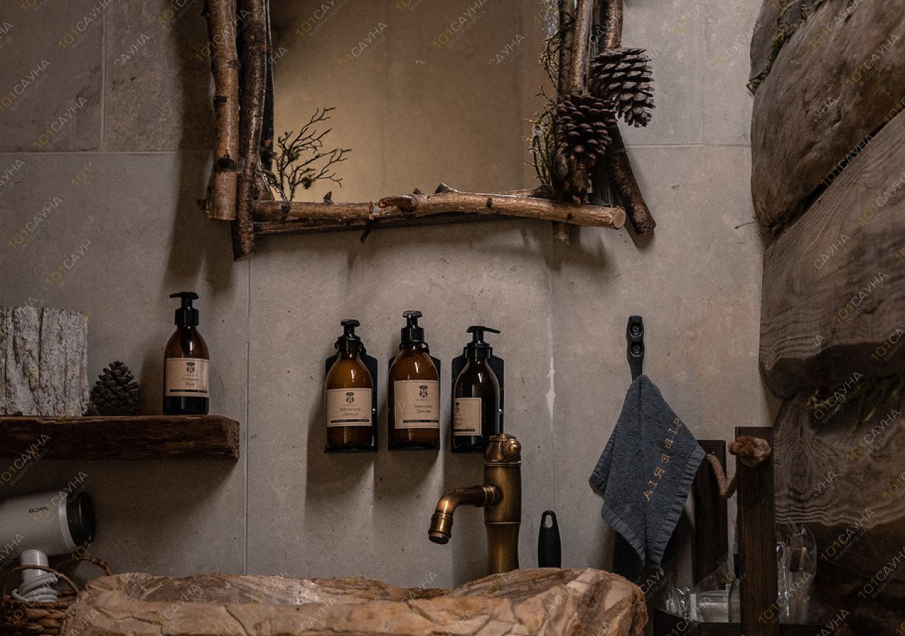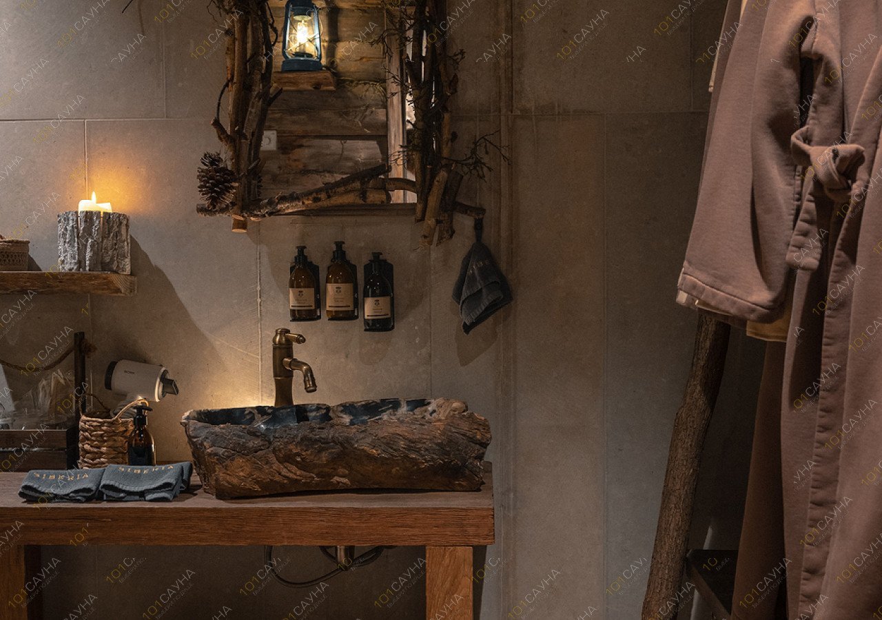 В бане используем очень много хвойных ароматов, в том числе их даёт парение можжевеловыми вениками. Отдыхая в горячем хвойном чане среди живых елок, гости слышат звуки сибирской тайги.