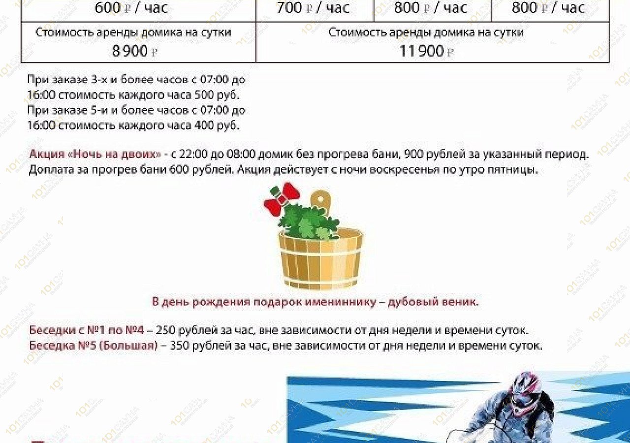 Предупреждаем о необходимости заранее бронировать и вносить предоплату за бани и сауны и предварительно созвониться с администратором по телефону. В противном случае бронь отменяется.