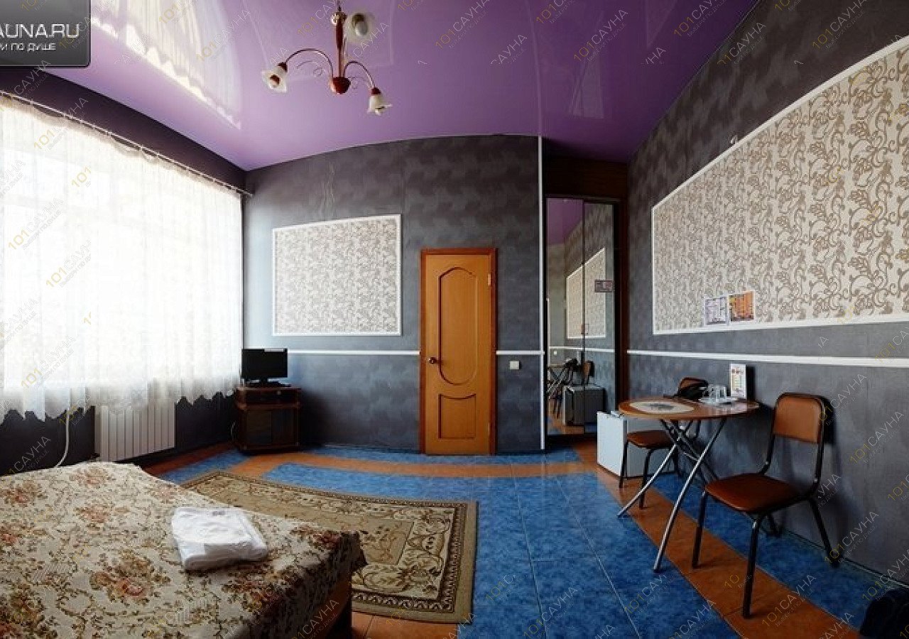 Уютный гостиничный номер выполненный в классическом стиле. Оформлен в темно сиреневой цветовой гамме с вставками классических орнаментов. Сиреневый потолок. Очень светлый гостиничный номер, огромное панорамное окно с видом на реку Омь и лодочную станцию. Из окна виден мост. В разное время года прекрасный пейзаж из окна, якро зеленый летом, оранжево красный осенью, белый и блестящим серебром зимой.
