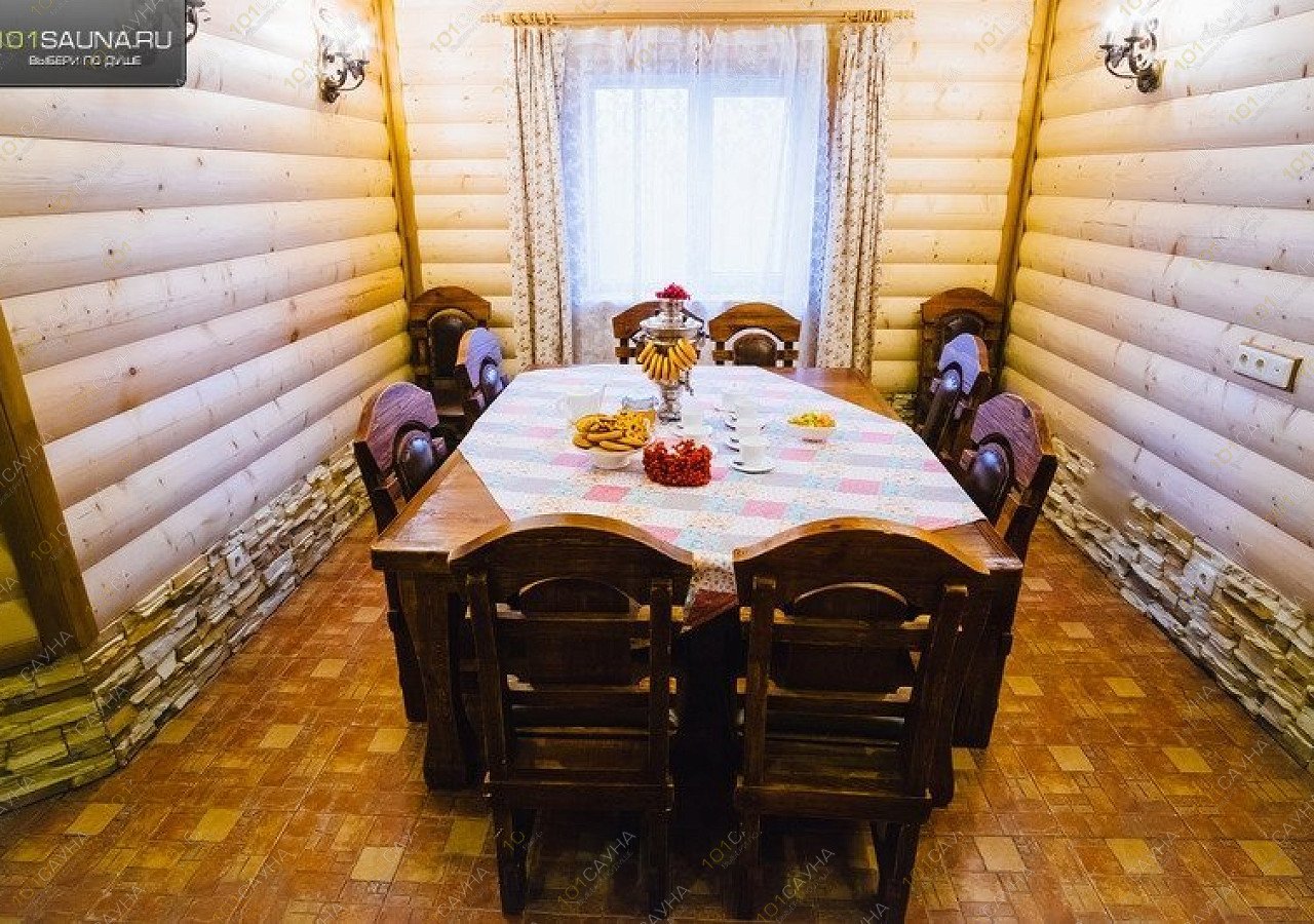 Внутри находится просторный зал с мебелью из цельного дерева и с отделкой под избу.