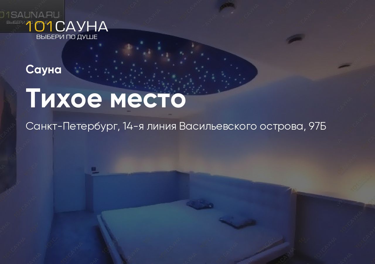 Сауна «Тихое место» — уютный банный комплекс в Василеостровском районе Санкт-Петербурга, работающий круглосуточно. Расположена на 14-й линии Васильевского острова, в шаговой доступности от метро Василеостровская.