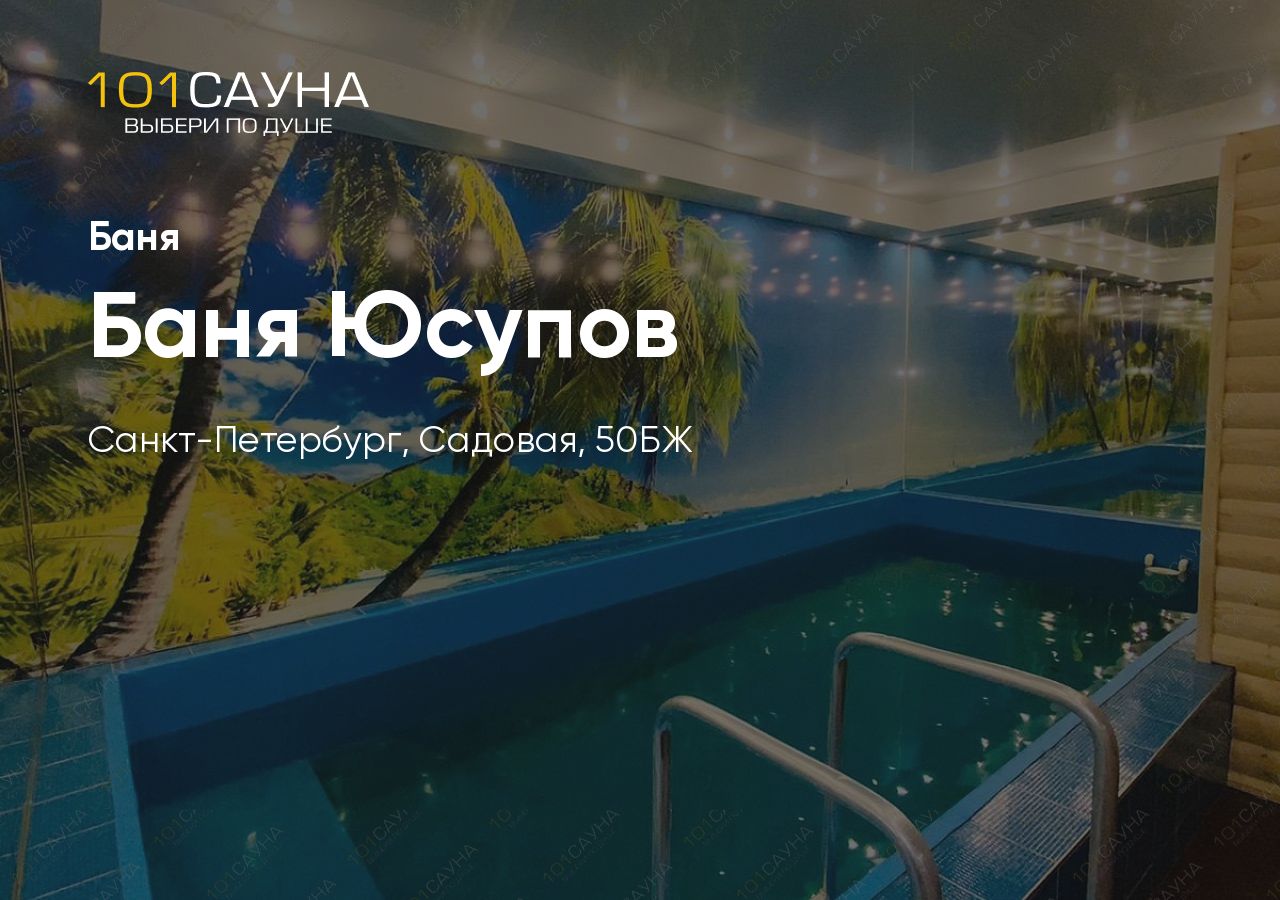 Баня Юсупов — банный комплекс в Адмиралтейском районе Санкт-Петербурга, на Садовой улице, 50БЖ. Просторная баня с большим бассейном, парными и комфортными зонами отдыха для компаний до 10 человек.