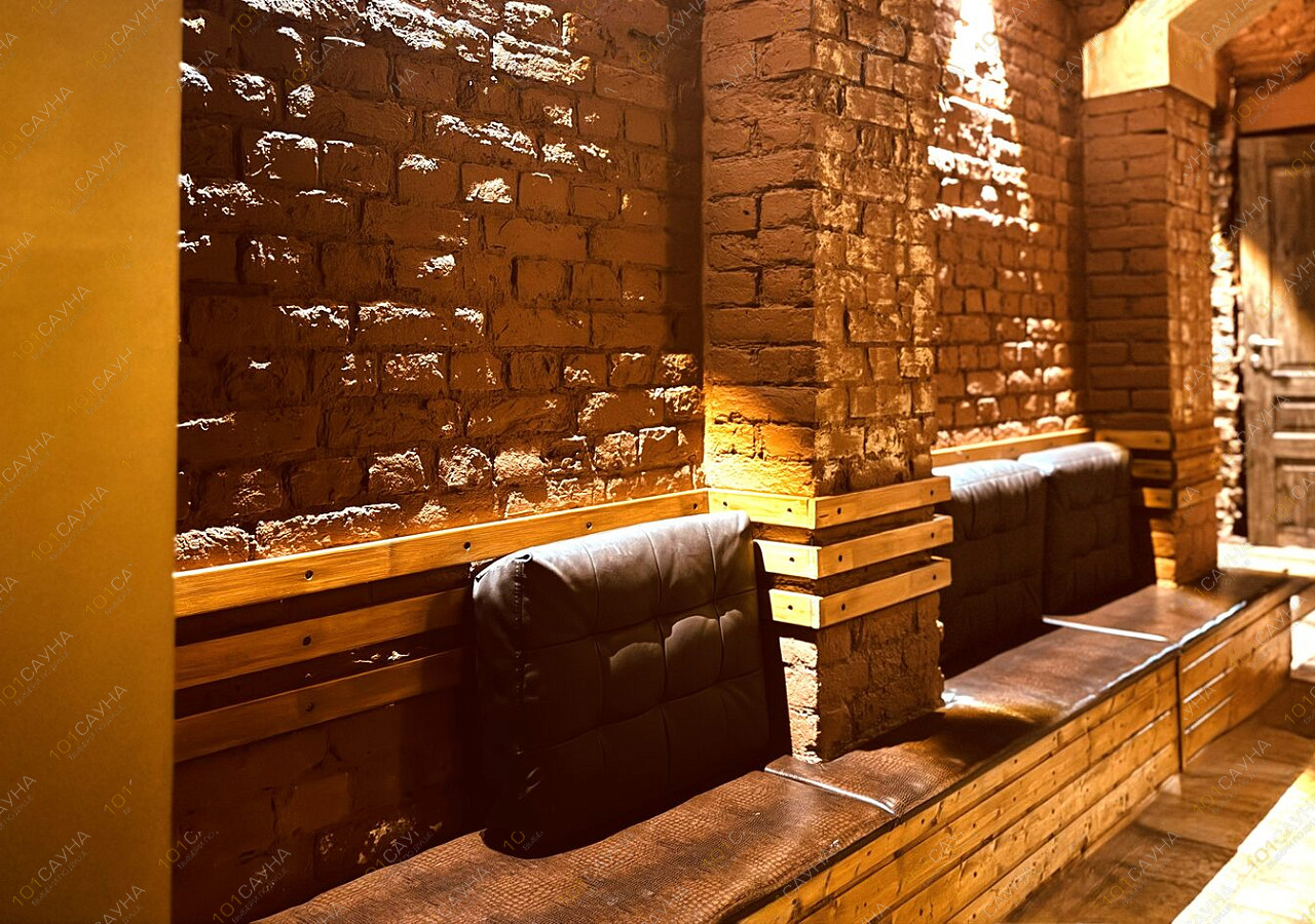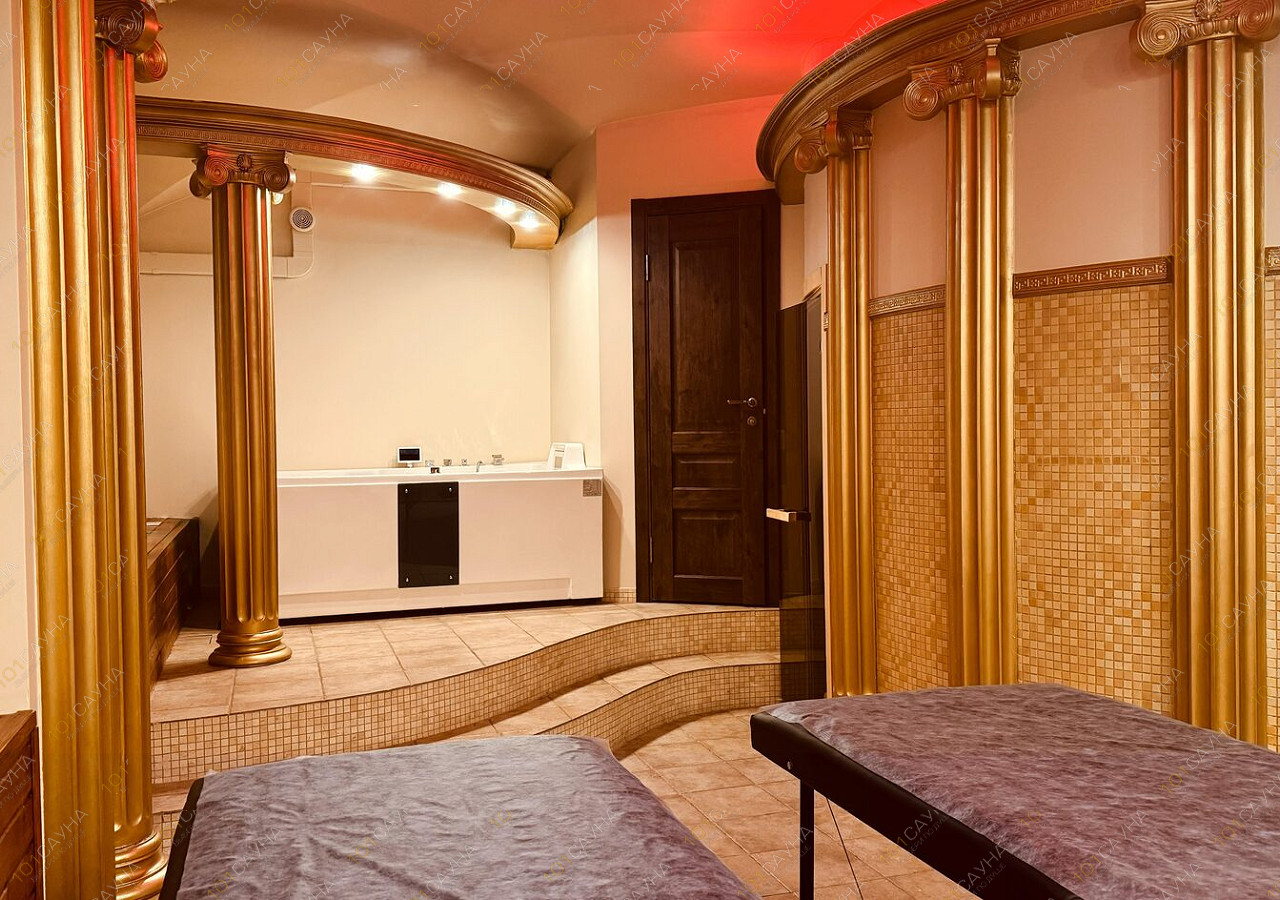 Просторная зона отдыха с золотыми колоннами и мягкой мебелью вмещает до 8 гостей. Всё для уютного отдыха после банных процедур.