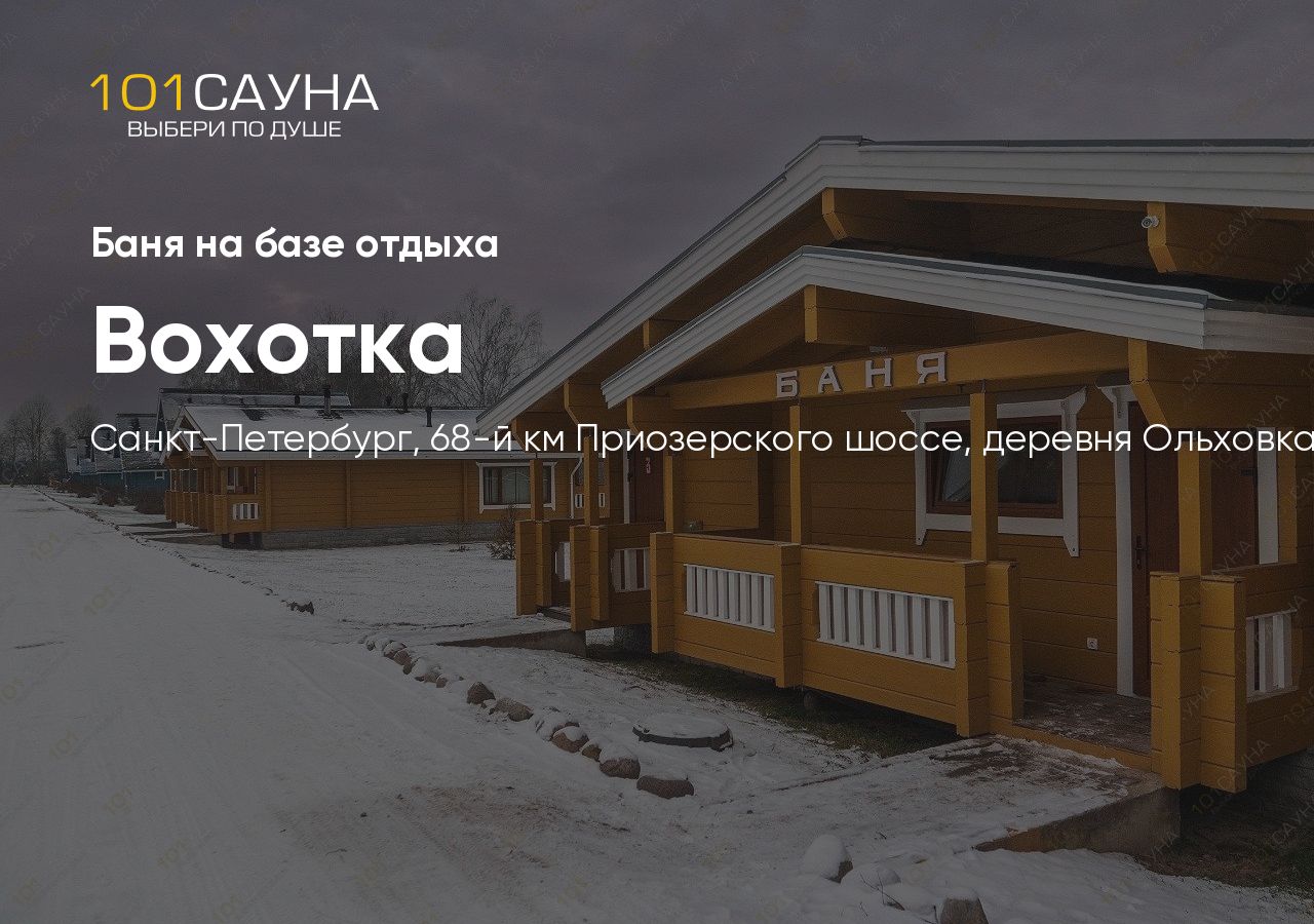 База отдыха «Вохотка» расположена на 68-м километре Приозерского шоссе, в деревне Ольховка. Удобный подъезд из Санкт-Петербурга.
