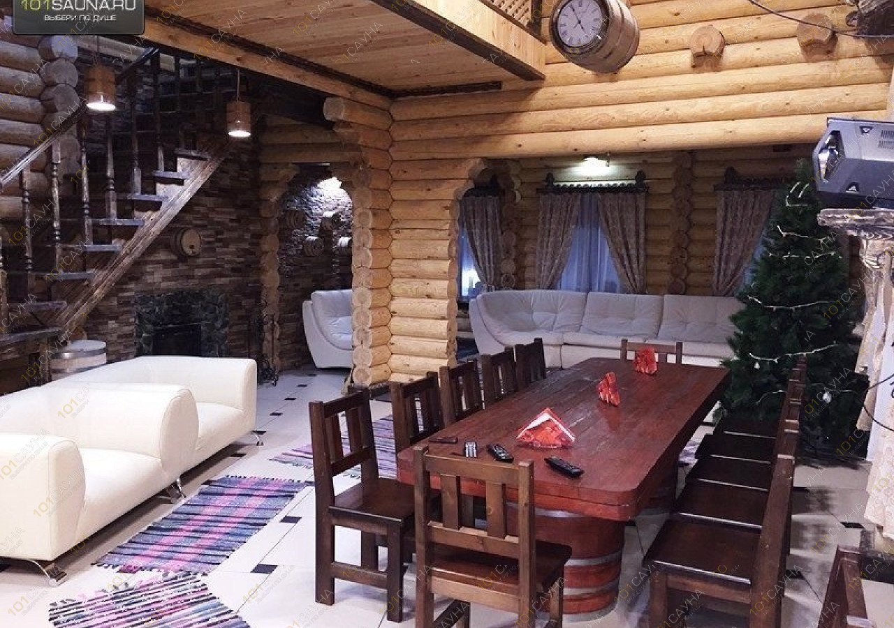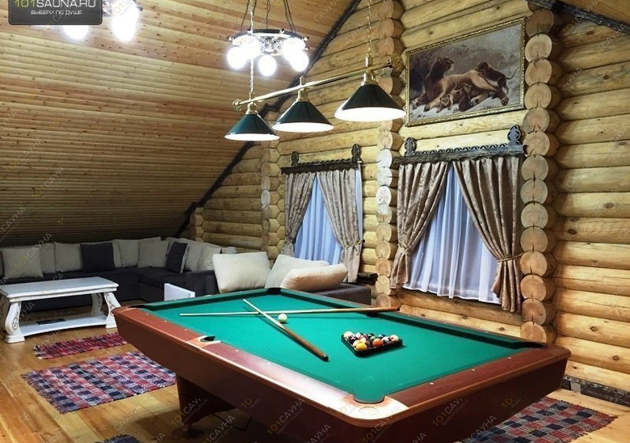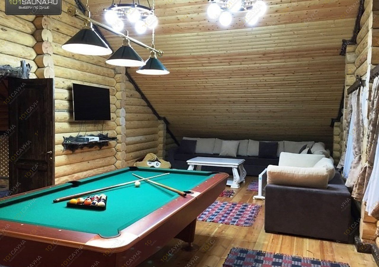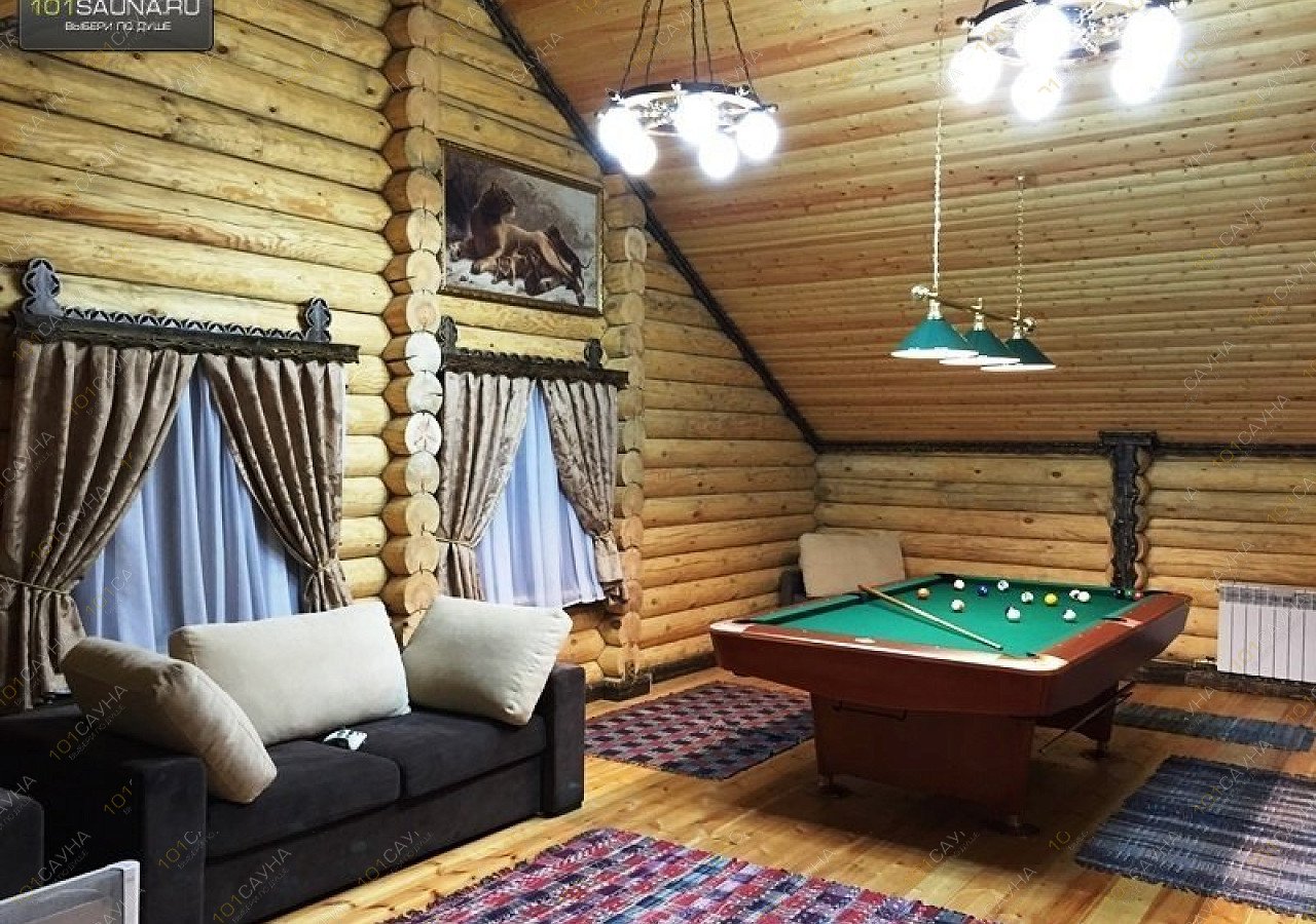 В большой бане, просторный зал с камином, зонами отдыха, большой стол на бочках, 12 стульев, зона кухни, теплая веранда. ТВ, музыкальный центр с цветомузыкой, караоке. Большая видовая деревянная лестница на второй этаж, на котором расположены две спальни, просторный коридор с зонами отдыха и балконом с которого виден первый этаж, бильярдная комната, игровой стол, зоны отдыха, ТВ, ДВД, игровая приставка Xbox-360. Два санузла один на первом, другой с душевой кабинкой на втором этаже. Возле бани