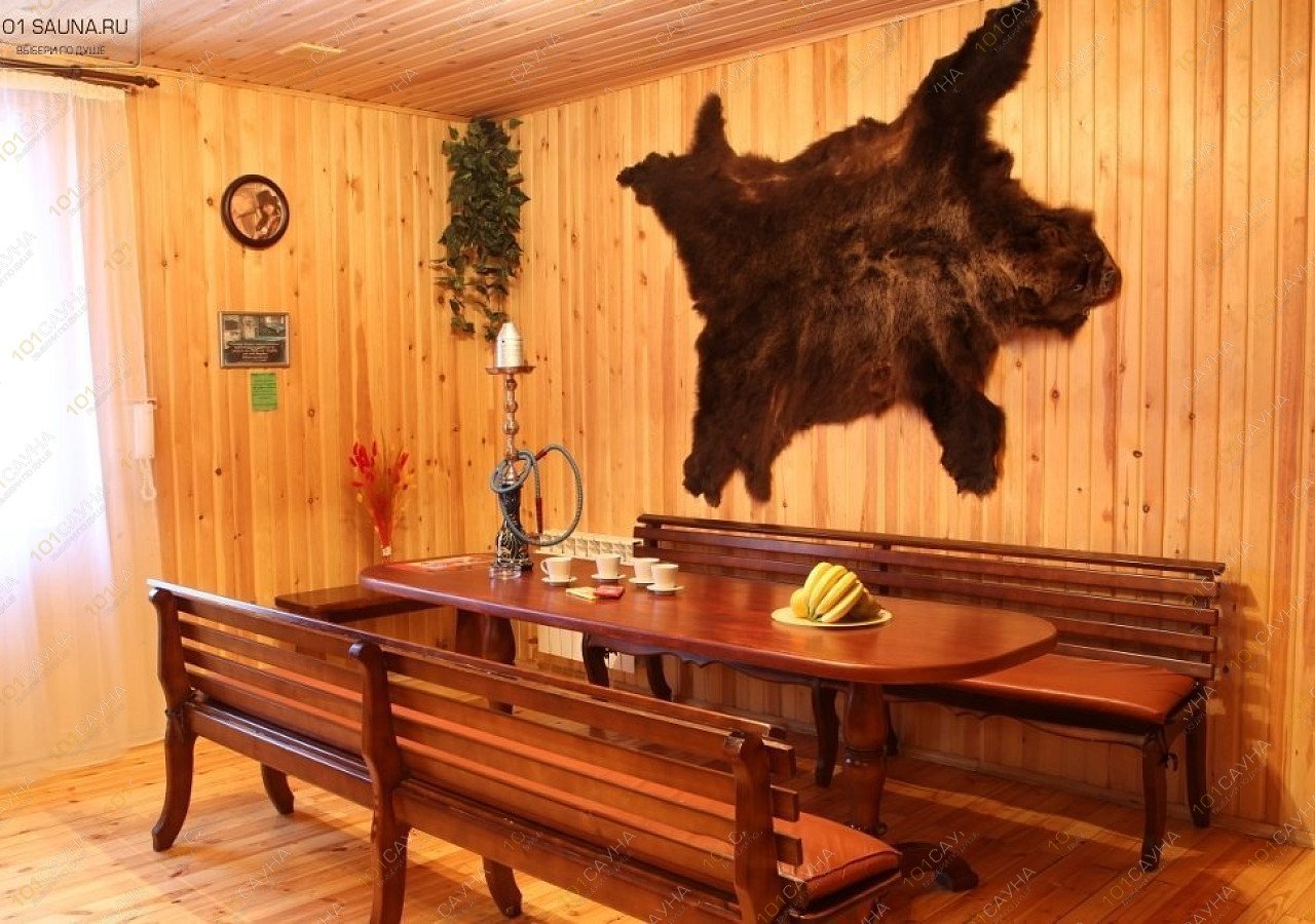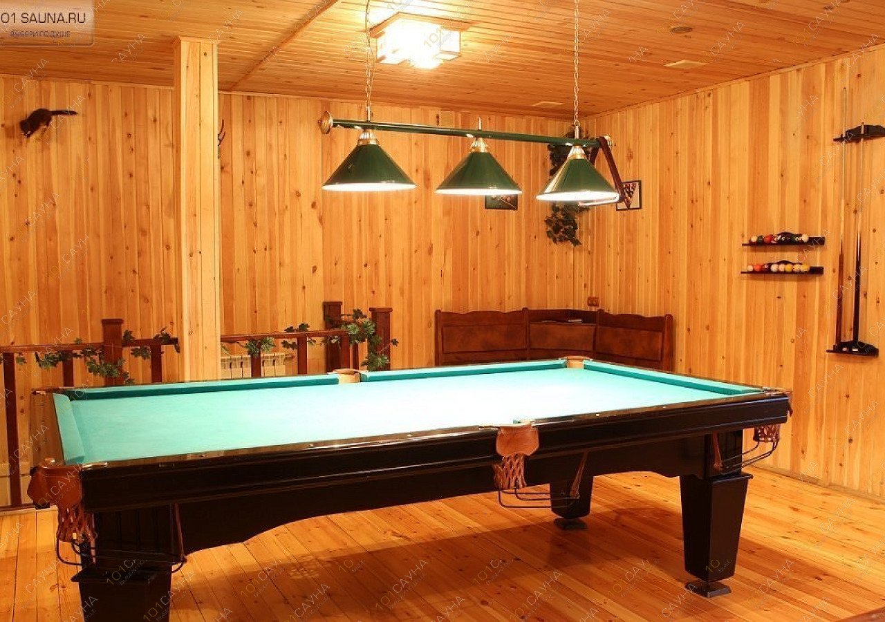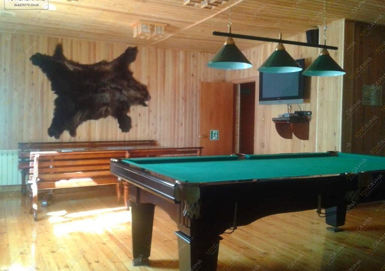Обстановка уютного деревянного коттеджа с деревянной лестницей и окном, жаркая финская парная, ведро после парной, душ, джакузи. много места в банкетном зале, бильярд (пул), удобная мебель из дерева, комната отдыха, медвежья шкура, DVD – TV, караоке, бар, кальян, веники. Бильярд, караоке и посуда для отдыхающих входит в стоимость номера. Четвёртый час отдыха в подарок.