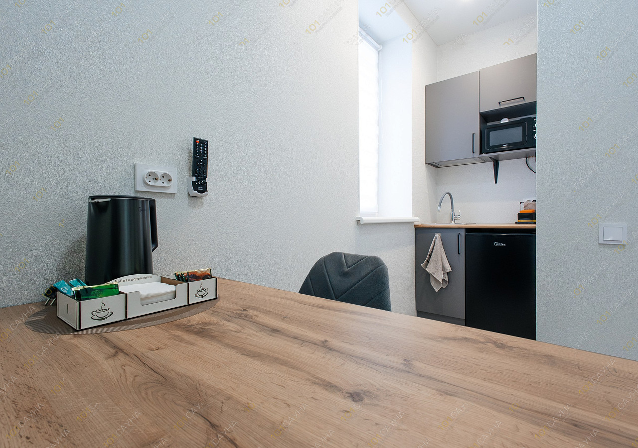 гостиная с кухонной зоной (холодильник, микроволновка, чайник,