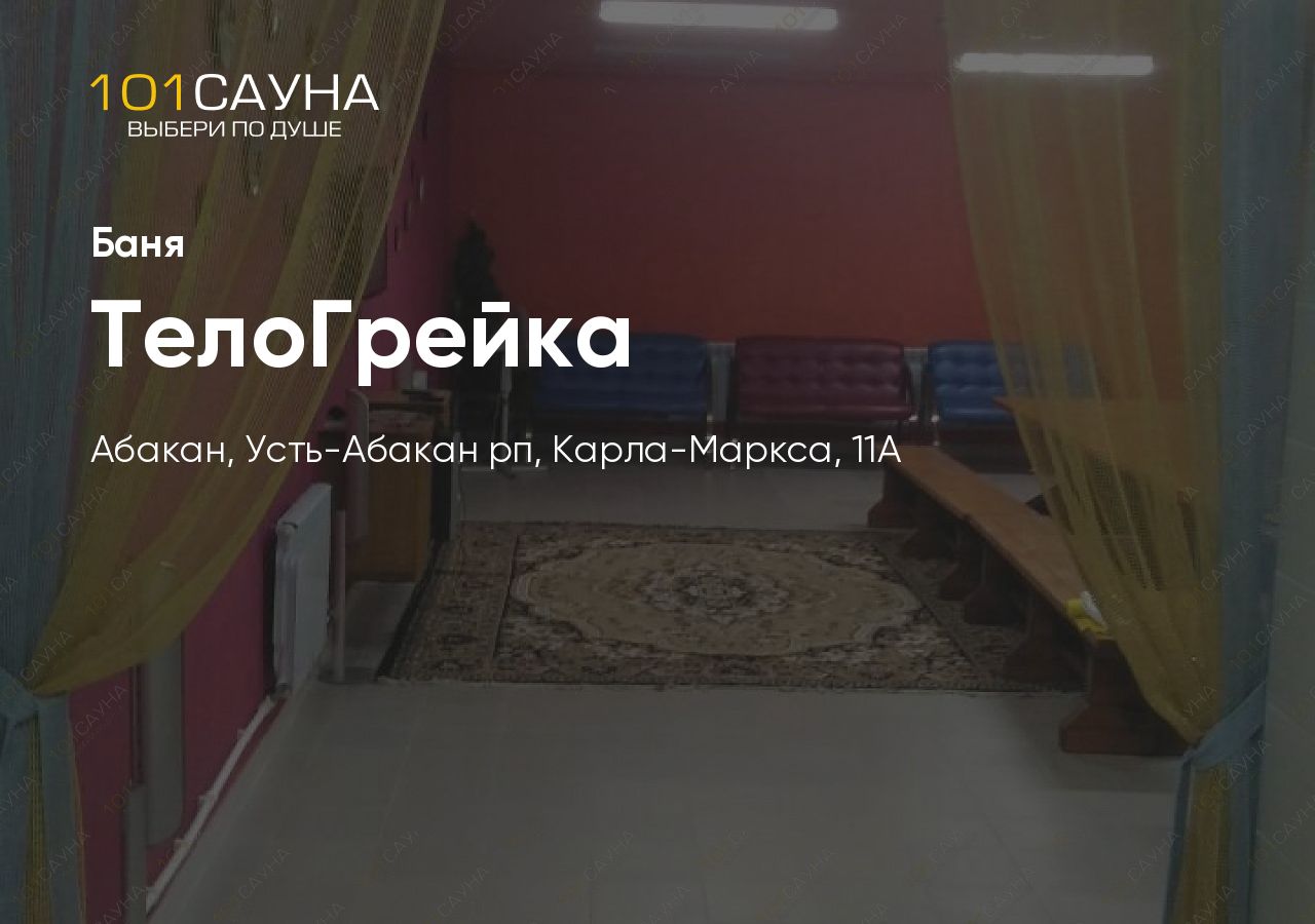 Сауна ТелоГрейка расположена в рабочем посёлке Усть-Абакан по адресу ул. Карла Маркса, 11А. Уютная сауна с русской парной работает круглосуточно и вмещает до 20 человек.