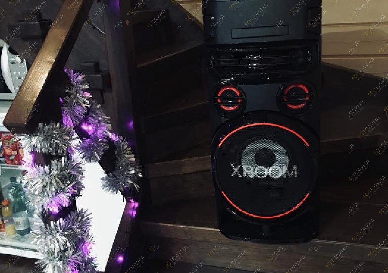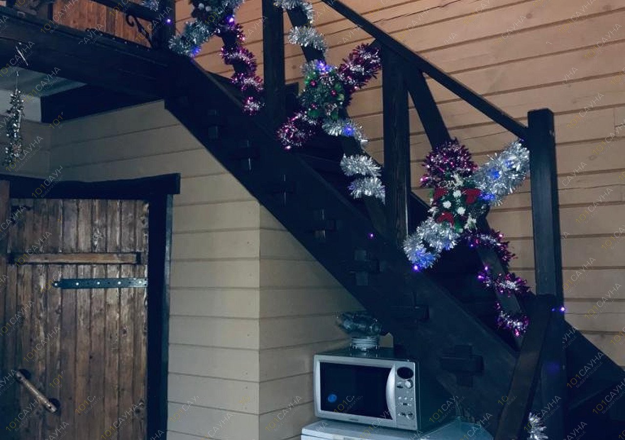 Это двух этажный дом. На первом этаже которого распологается вместительная жаркая парилка, душевая с обливным ведром и душевыми панелями, присутствует фен для волос, большая комната отдыха на первом этаже с телевизором, караоке автоматом, холодильником. Можно взять музыкальную колонку.